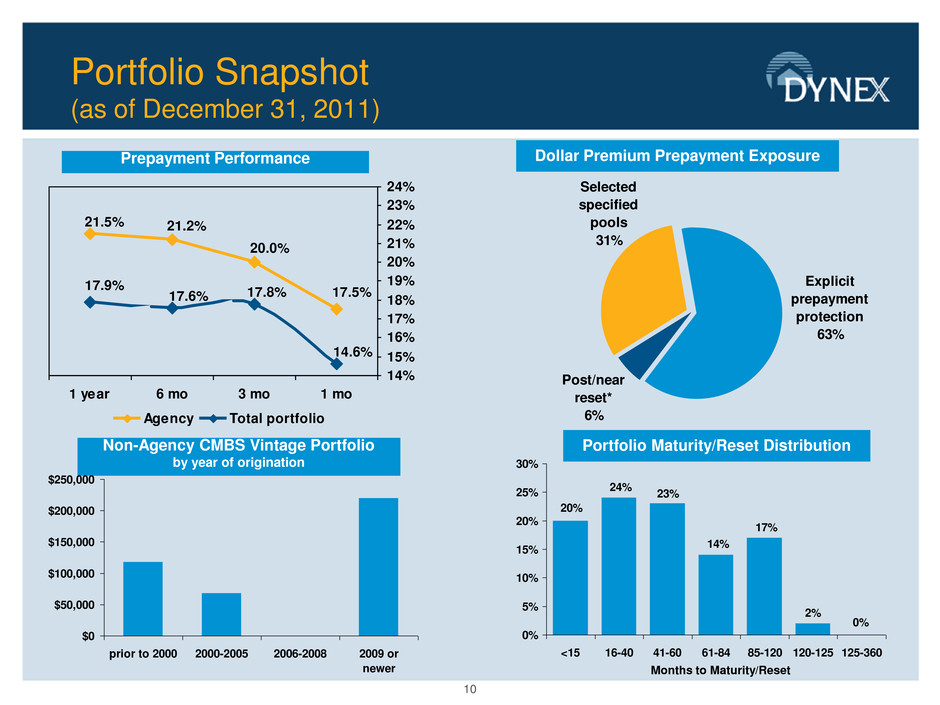 17 Selected Financial Highlights (as of and for the quarter ended) Financial Highlights: ($000 except per share amounts) Dec 31, 2011 Sept 30, 2011 Jun 30, 2011 Mar 31, 2011 Dec 31, 2010 Total Investments 2,500,976$ 2,595,574$ 2,591,097$ 2,279,610$ 1,614,126$ Total Assets 2,582,193 2,633,686 2,656,703 2,359,816 1,649,584 Total Liabilities 2,210,844 2,264,152 2,269,843 1,976,323 1,357,227 Total Equity 371,349 369,534 386,860 383,493 292,357 Interest Income 23,704 21,143 21,065 17,465 14,281 Interest Expense 6,732 6,583 6,032 4,734 3,385 Net Interest Income 16,972 14,560 15,033 12,731 10,896 General and Administrative Expenses 3,249 2,335 2,255 2,118 2,911 Net income 14,406$ 1,532$ 13,594$ 10,280$ 9,646$ Diluted EPS 0.36$ $ 0.04* 0.34$ 0.31$ 0.40$ Dividends declared per common share 0.28 0.27 0.27 0.27 0.27 Book Value per share 9.20 9.15 9.59 9.51 9.64 * Diluted EPS Ex-Items was $0.32. EPS Ex-Items, or Dynex’s earnings per share excluding certain items, excludes from GAAP earnings per share the impact of litigation settlement and related defense costs of $8.2 million (or $0.20 per diluted common share), a loss of $2.0 million (or $0.05 per diluted common share) on redemption of non-recourse collateralized financings, and $1.3 million (or $0.03 per diluted common share) in net accelerated premium amortization due to an increase in forecasted prepayment speeds during the third quarter of 2011. See the Company’s press release issued November 1, 2011 for further discussion.