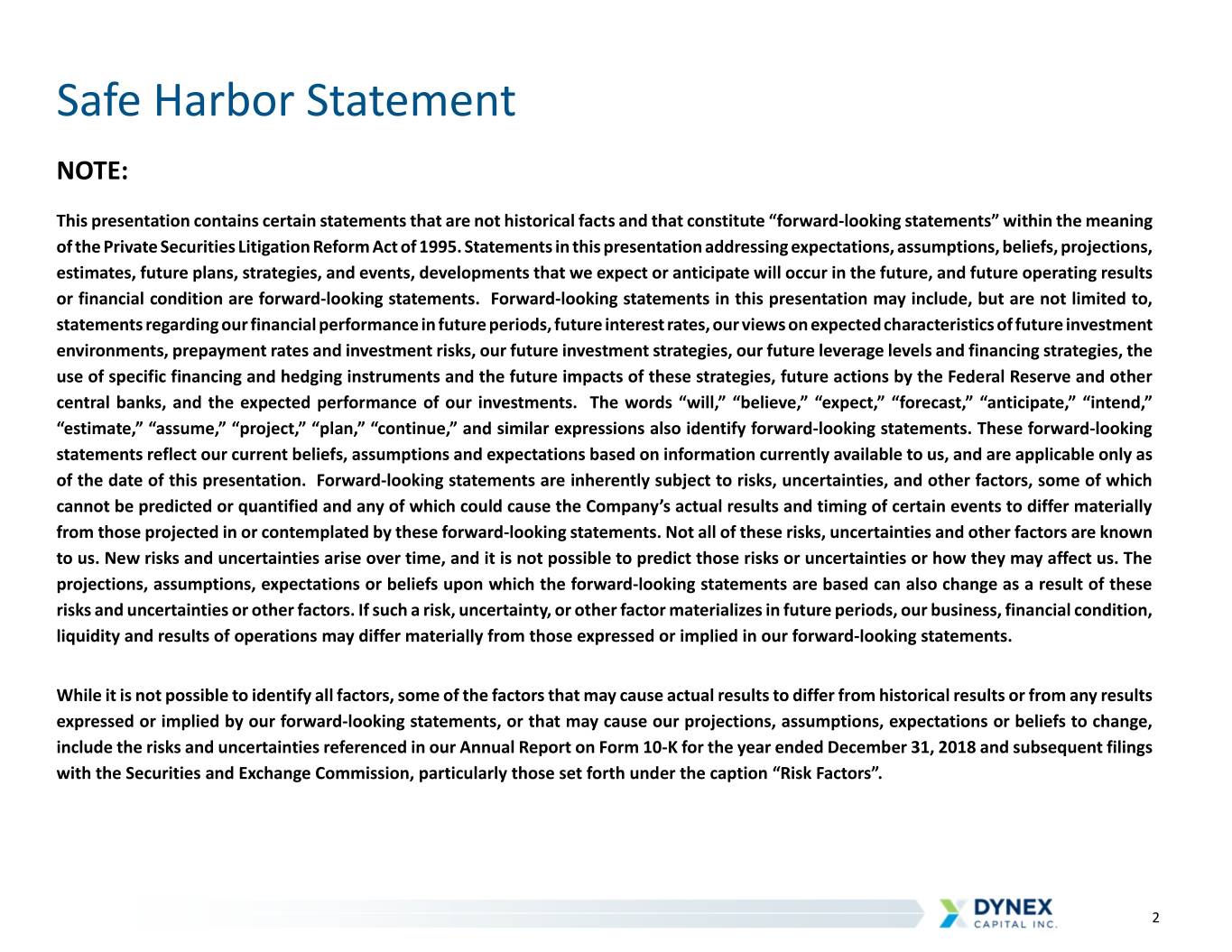 Safe Harbor Statement NOTE: This presentation contains certain statements that are not historical facts and that constitute “forward-looking statements” within the meaning of the Private Securities Litigation Reform Act of 1995. Statements in this presentation addressing expectations, assumptions, beliefs, projections, estimates, future plans, strategies, and events, developments that we expect or anticipate will occur in the future, and future operating results or financial condition are forward-looking statements. Forward-looking statements in this presentation may include, but are not limited to, statements regarding our financial performance in future periods, future interest rates, our views on expected characteristics of future investment environments, prepayment rates and investment risks, our future investment strategies, our future leverage levels and financing strategies, the use of specific financing and hedging instruments and the future impacts of these strategies, future actions by the Federal Reserve and other central banks, and the expected performance of our investments. The words “will,” “believe,” “expect,” “forecast,” “anticipate,” “intend,” “estimate,” “assume,” “project,” “plan,” “continue,” and similar expressions also identify forward-looking statements. These forward-looking statements reflect our current beliefs, assumptions and expectations based on information currently available to us, and are applicable only as of the date of this presentation. Forward-looking statements are inherently subject to risks, uncertainties, and other factors, some of which cannot be predicted or quantified and any of which could cause the Company’s actual results and timing of certain events to differ materially from those projected in or contemplated by these forward-looking statements. Not all of these risks, uncertainties and other factors are known to us. New risks and uncertainties arise over time, and it is not possible to predict those risks or uncertainties or how they may affect us. The projections, assumptions, expectations or beliefs upon which the forward-looking statements are based can also change as a result of these risks and uncertainties or other factors. If such a risk, uncertainty, or other factor materializes in future periods, our business, financial condition, liquidity and results of operations may differ materially from those expressed or implied in our forward-looking statements. While it is not possible to identify all factors, some of the factors that may cause actual results to differ from historical results or from any results expressed or implied by our forward-looking statements, or that may cause our projections, assumptions, expectations or beliefs to change, include the risks and uncertainties referenced in our Annual Report on Form 10-K for the year ended December 31, 2018 and subsequent filings with the Securities and Exchange Commission, particularly those set forth under the caption “Risk Factors”. 2