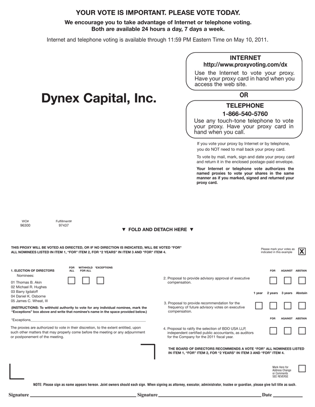Telephone and Internet voting for shareholders of record will be available 24 hours a day and will close at 11:59 p.m. Eastern Time on May 10, 2011. If you hold shares in the Dynex Capital, Inc. 401(k) Plan, your voting instructions for those shares must be received by 5:00 p.m. Eastern Time on May 9, 2011 to allow sufficient time for voting by the trustee of the plan.
